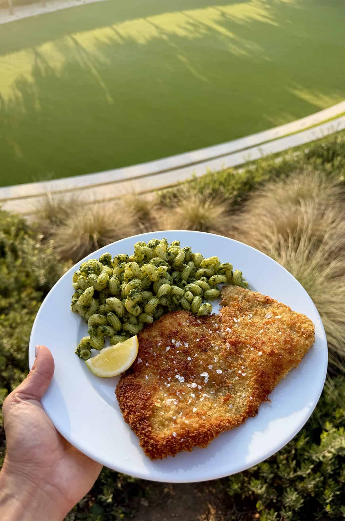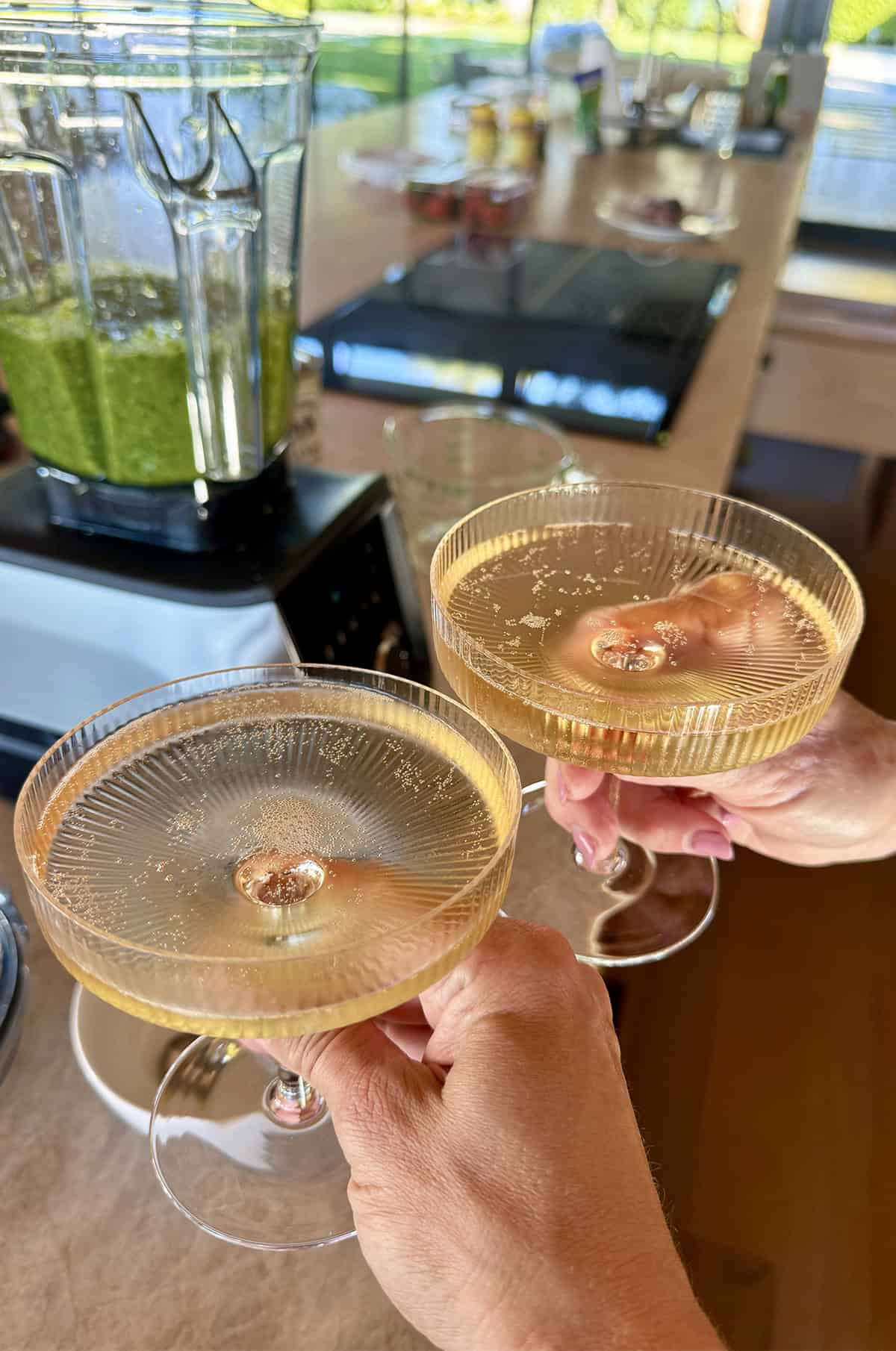 The Chicken Milanese, a.k.a. Chicken Schnitzel (or Little Guys), is usually on the Tuesday Dinner at Noni’s House menu. Here they are below, paired with Noni’s famous Basil Pesto… and of course, matching glasses of Champagne!