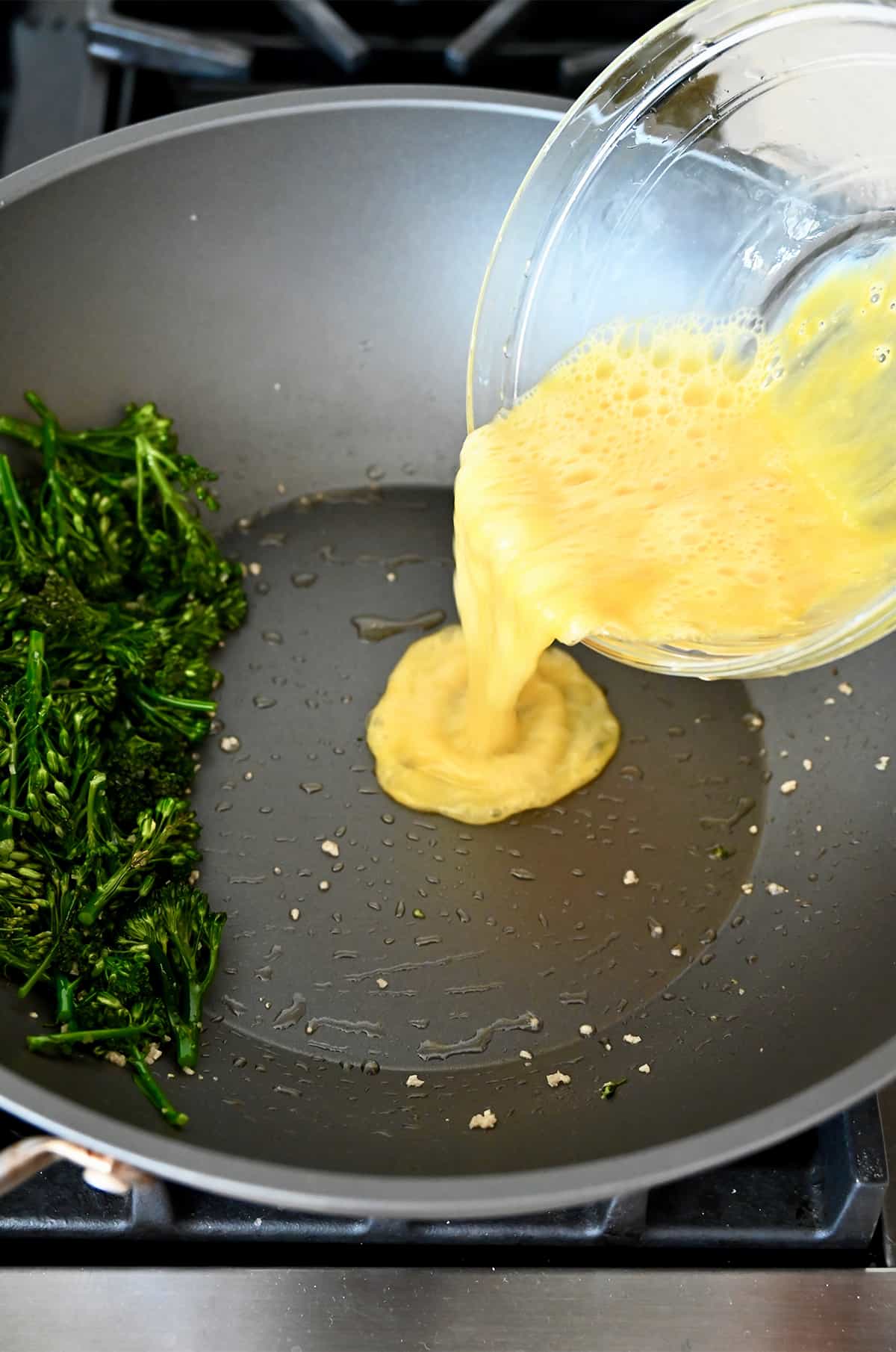 - Push all the ingredients to one side of the pan then add the eggs and scramble until cooked through. Fold the eggs into the broccolini then transfer all the ingredients to a plate and wipe the skillet clean.