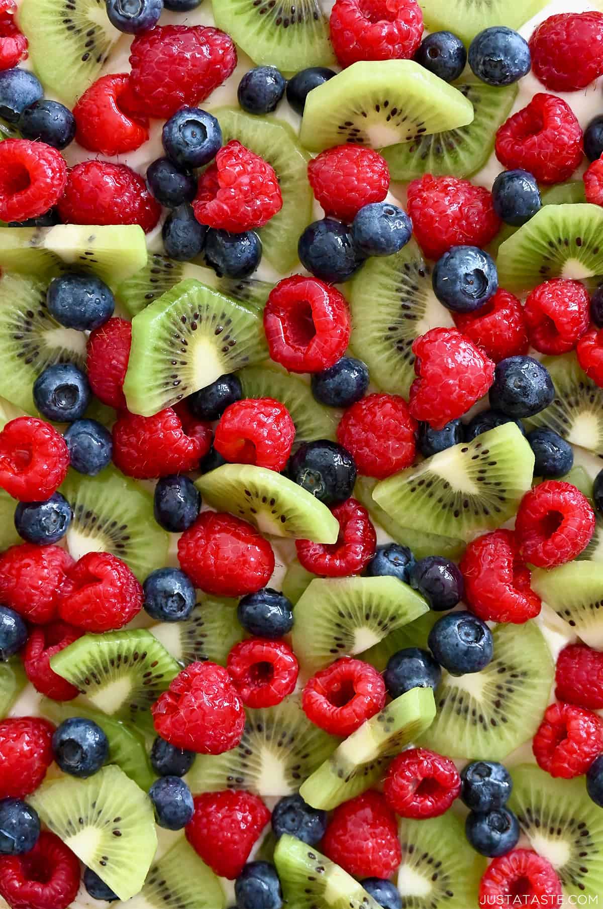 There’s a time and a place for high-protein pizza crust, a dessert pizza is not the time or place! And while you could easily make this fruit pizza with your favorite cookie dough, I opted for the classic sugar cookie base. It has a soft and chewy center with a slightly crisp edge. It’s actually the same recipe I use to make cutout sugar cookies during the holiday season, and it’s totally foolproof.