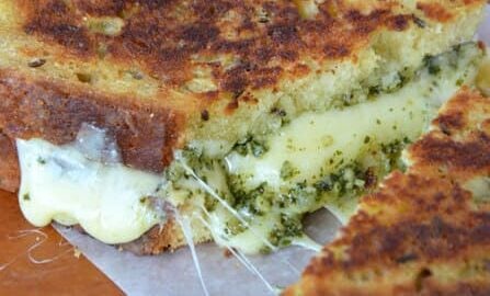 When ready to assemble the grilled cheese, spread 4 slices of the soda bread with the prepared basil pesto, and then add a few slices of the Irish cheddar. Form sandwiches by topping off each slathered side with a second piece of bread, and then butter both exterior sides of the bread. (See Kelly's Notes.)