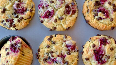 Reduce the mixer speed to low, then gradually beat in the flour mixture, sour cream and vanilla just until combined. Fold in the raspberries and chocolate chips.