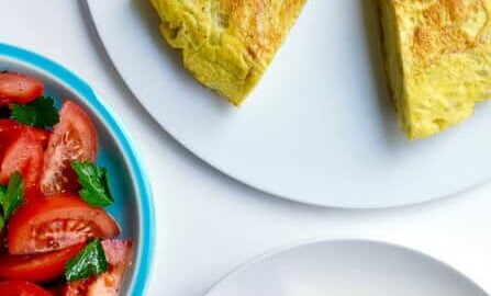 Add 1 tablespoon olive oil to a non-stick sauté pan set over medium heat. Add the potato mixture to the pan and using a spatula, gently lift the mixture so the uncooked eggs flow underneath. Spread the mixture into an even layer, reduce the heat to low and cook the tortilla, occasionally releasing the edges with a spatula. Once the eggs are mostly set, place a plate atop the pan then invert the pan to flip the tortilla onto the plate. Return the tortilla to the pan (uncooked side down) and continue cooking until the eggs are fully set.